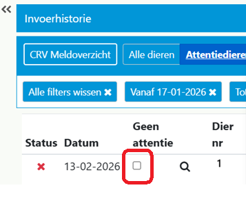 4. Wanneer u zeker bent dat de melding correct bij CRV/I&R is verwerkt en niet opnieuw vanuit AgroVision Cows verstuurd hoeft de worden, kunt u het vinkje aanzetten bij ‘Geen attentie’. Dan is het dashboard niet meer rood.