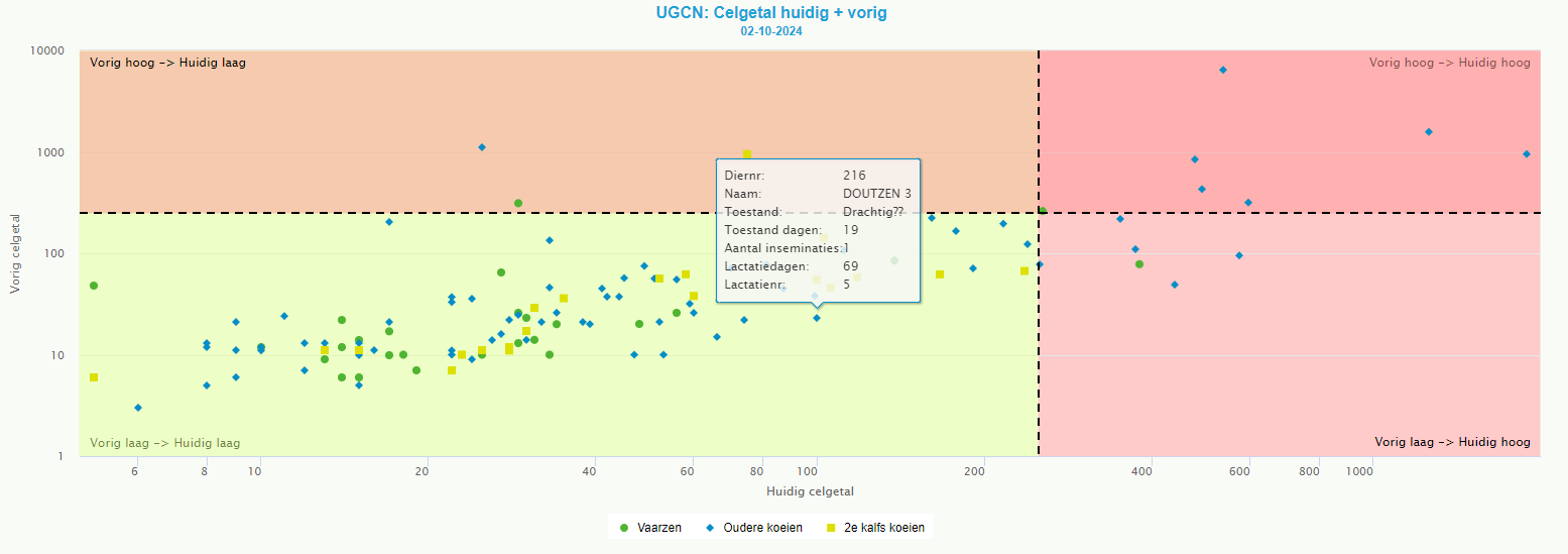 Onder Dieranalyse - Diergezondheid - Uiergezondheid (UGCN) - 02. UGCN: Celgetal huidig + vorig is een grafiek op te vragen die weergeeft de dieren hun celgetal van de huidige MPR ten opzichte van de vorige MPR.